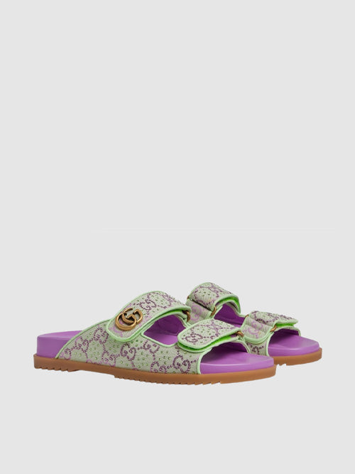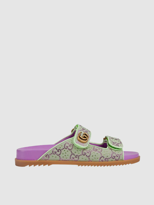 구찌 샌들 더블 G 퍼플 그린 GG 크리스탈 캔버스